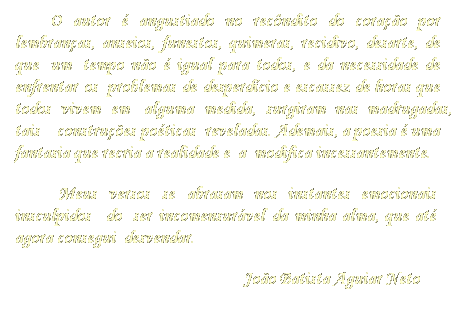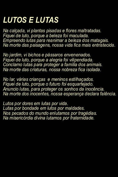 DESENCONTROS E ENCONTROSQueria fotografar a beleza de teu sorrisoMas tu não estavas aqui Fotografei a beleza das crianças Nelas encontrei tua delicadeza. Queria cantarolar a doçura da tua voz Mas tu não estavas aqui Recitei a elegância das poesias Nelas encontrei tua suavidade. Quis ter tua luz Te vi nos raios dos astros. Quis ter tua afeição Te vi nos suspiros dos sentimentos. Quis ter tua graça Te vi na oferenda do universo. Quis ter teu querer Naufraguei nos porões de minha alma E nas profundezas de meu ser te encontrei. |